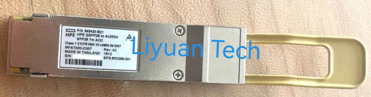Manufacturer: HPE Part number: 845420-B21 Form Type: QSFP28 to 4xSFP28 Length (m): 7M Speed: 100GBase Speed Description: 100-Gigabit Transceiver Type: AOC Media: Fiber Availability: Used Lead time-7days Trading terms: TT wire transfer Warranty period: 180days Country of origin: MY Operating Temperature: 0 to 70°C After placing the order, it will be delivered within one week via DHL international express delivery HPE 845420-B21 100GBase-AOC QSFP28 to 4xSFP28 Active Optical Cable operates over multimode fiber with a maximum reach of 7.0 meters (23.0 feet). Programmed, uniquely serialized, and tested for data traffic and applications at 850nm wavelength, it ensures 100% compliance and functionality. This active optical cable complies with Trade Agreements Act (TAA) standards. In addition to HPE 845420-B21 , Liyuan Tech supply a wide range of other Optical transceiver . If you have any need or interest, please feel free to send inquiry to global@chn-liyuan.com